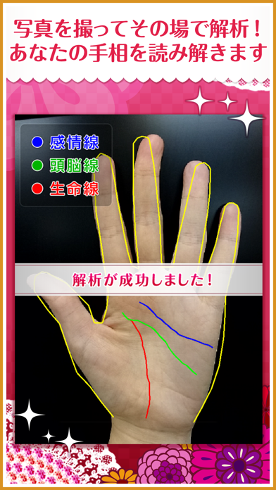 - カメラで両手のひらを撮影するだけ。恋愛に関する手相アプリ