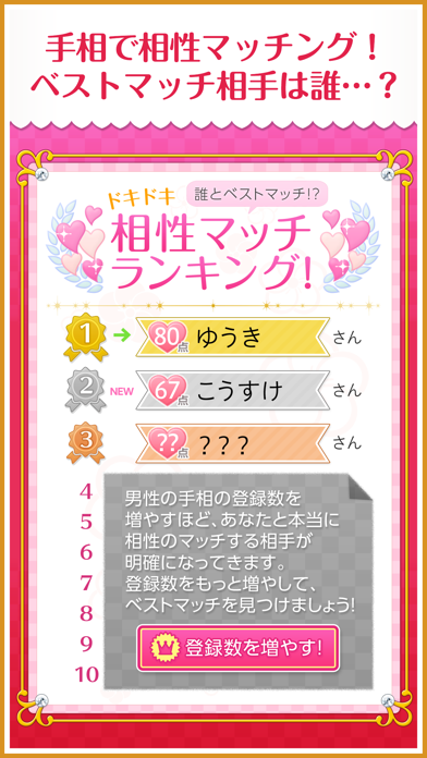 - カメラで両手のひらを撮影するだけ。恋愛に関する手相アプリ
