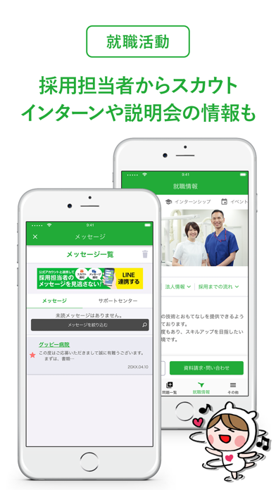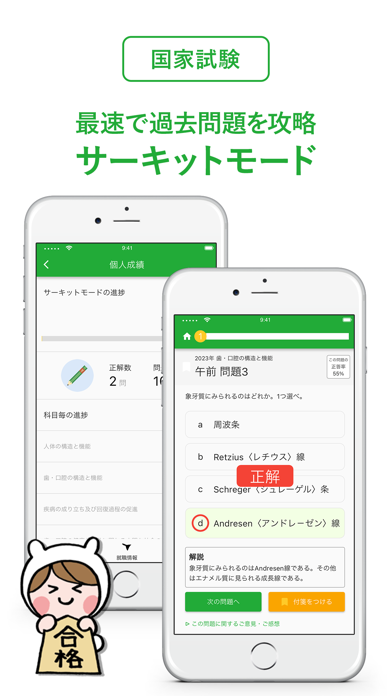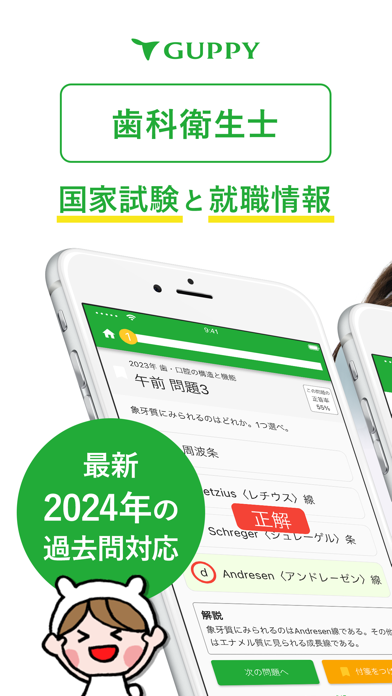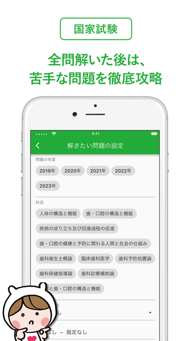 国家試験の過去問を解いたり、求人情報を見たりできるアプリ。歯科衛生士を目指すなら必携です。国家試験の過去問は1,087題収録。さまざまな分野の問題を解けます。科目や出題年で検索もできるので、苦手な分野を克服できます。