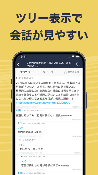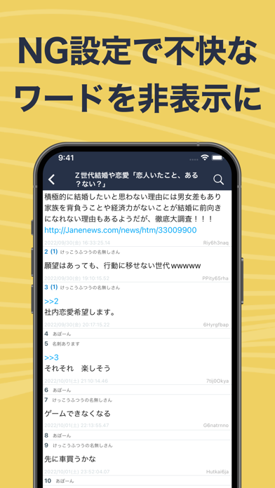 • 不快な単語やユーザーはNG設定で非表示に。スレッド単位で設定できる