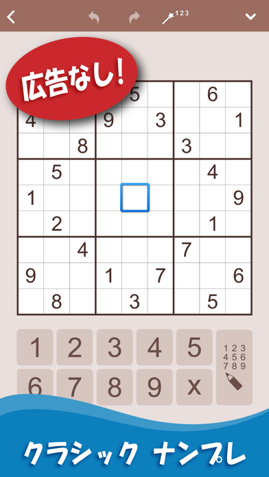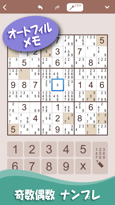 操作方法も非常に快適で、埋めたいマス目を選び、キーパッドの数字を選択するだけで入力が完了します。もちろん消したい時も×をワンタップするだけで削除が完了します。更に、メモモードにして候補数字を入力しておくことも可能です。まさに紙と鉛筆で解いているかのように自然に解いていけるなナンプレアプリです。
