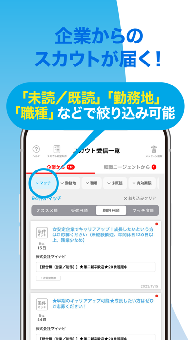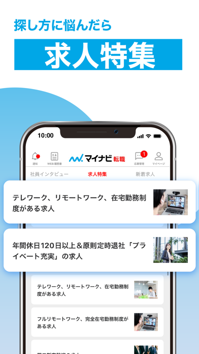 - 検索履歴をもとにおすすめ求人を提案。自分に合った募集が見つかりやすい