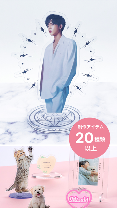 | 制作できるグッズ | アクリルスタンド、フェイスタオル、缶バッヂ、スマホケースなど |