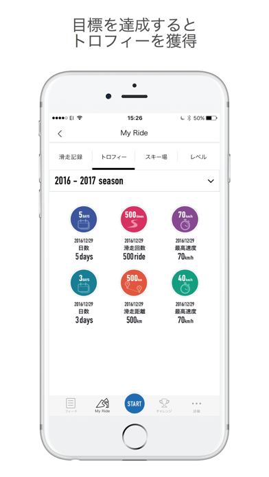 滑走した日数や本数などに応じて、トロフィーがもらえるコレクション要素を搭載。位置情報から、どの地域のスキー場に行ったかも記録され、エリアごとのアチーブメントがもらえます。ちょっとしたお楽しみ要素として集めていけます。
