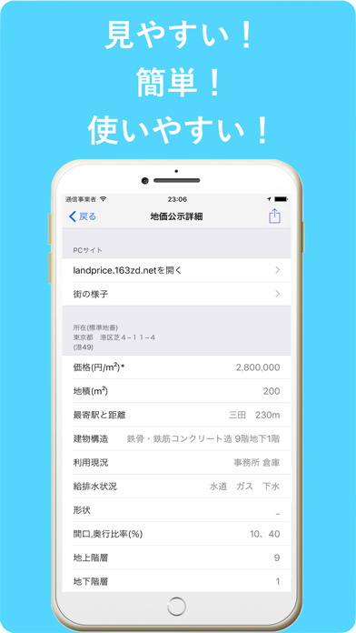 地図上から地価情報が公開されている場所や大体の価格がわかります。。現在地からの検索も可能で、気になる場所をタップすれば公示や調査による土地や建物の詳細情報がすぐに確認できます。不動産取引や資産評価に必要な情報を効率的に調べたいときに便利です。