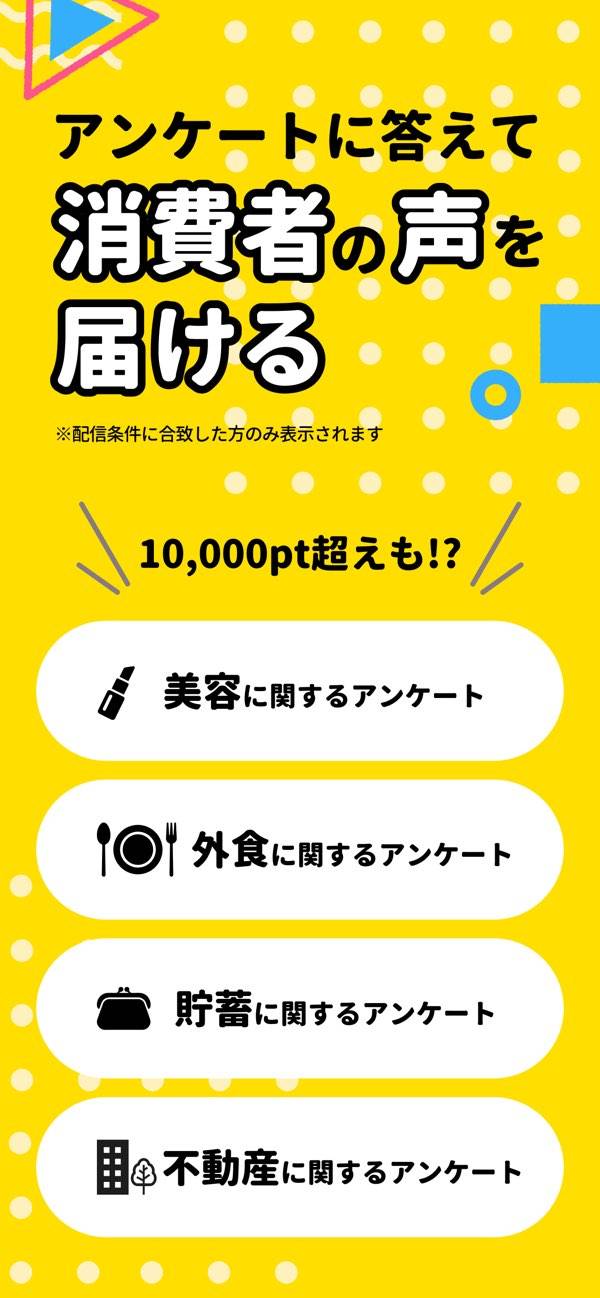 アンケートに答えるだけでポイントが貯まるアプリです!アンケートと言えども二択の簡単な質問に答えるだけです!ポイント系のアプリにありがちな10pt1円ではなく1pt1円なのでわかりやすいです。