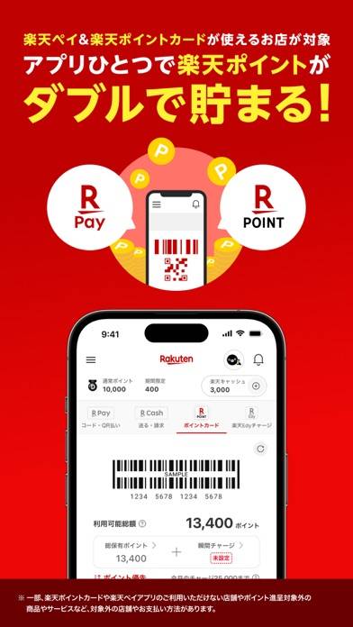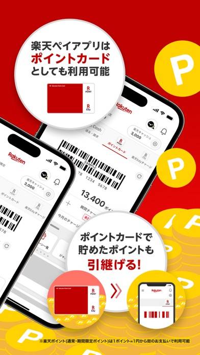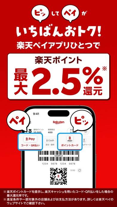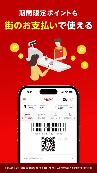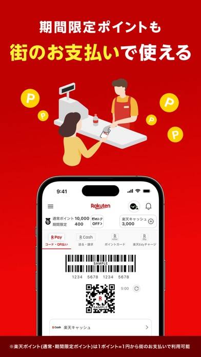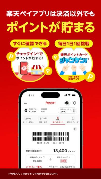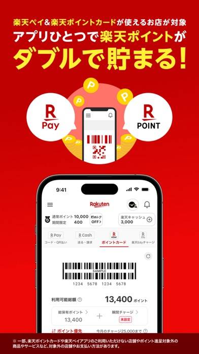 バーコードで決済できるほか、支払額に応じてポイントが貯まります。さらに楽天ポイントカードを提示すれば、ダブルでポイントを貯められるのが大きなメリット。お得にお買い物をしたい楽天ユーザーにはぴったりです。