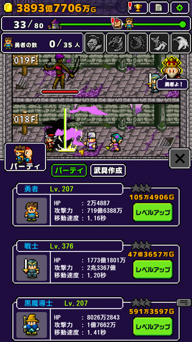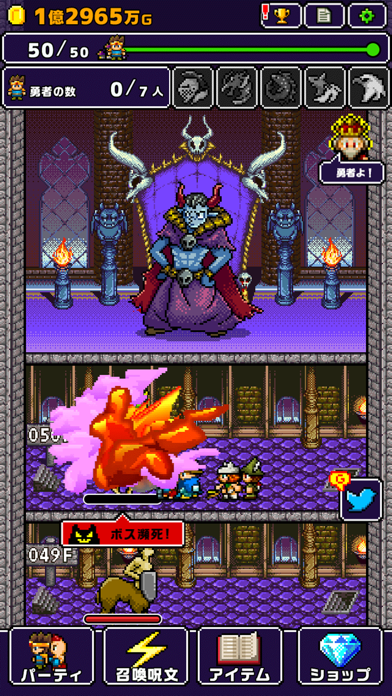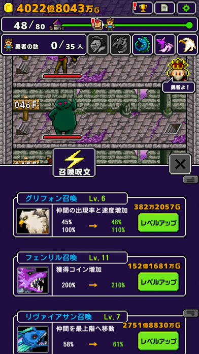 ▲勇者とその仲間たちを召喚して、最上階にいる魔王の部屋を目指す。何回も挑戦して、仲間を強化させるためのお金を集めよう。