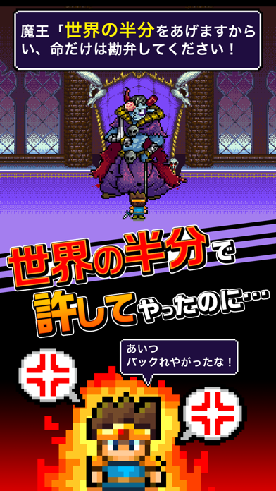 口約束は信用できない・・・。世界の半分をもらいに、魔王城まで取り立てに行くRPG風タップゲーム!各階の魔物を倒してコインをゲット。レベルアップしたり、仲間や魔法を覚えて最上階を目指す。勇者パーティーの数もガンガン増やせるし、放置しててもコインが溜まるので気軽に遊べる!