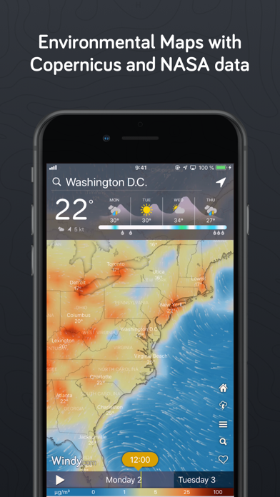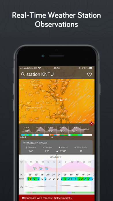 さまざまな高精度気象モデルを駆使し、天候の変化を予測。精度の高い情報を提供してくれます。風向きや気温を視覚的にとらえられ、1時間ごとの気温や天気などが一瞬でわかります。