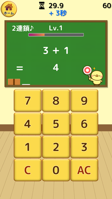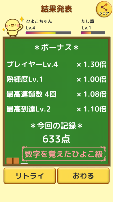 ひよこが可愛い(笑)計算は得意な方だと自負していたけど3桁の足し算に入った瞬間にノックアウト(°▽°)悔しくて何度もプレイしてたら、いつの間にかひよこちゃんがレベル10に(笑)レベルが上がるとハイスコアも出やすくなるから、やり込み好きにはオススメ!ランキング機能もあって燃える!