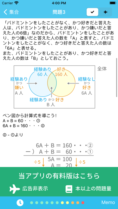 “最適学習モード”を使って、効率良くSPI対策ができます。未学習と苦手な問題に絞って出題されるので、スキマ時間を使った問題演習にもぴったり。全問題の解答には詳しい解説が付いており、類題を解く応用力が身につくでしょう。