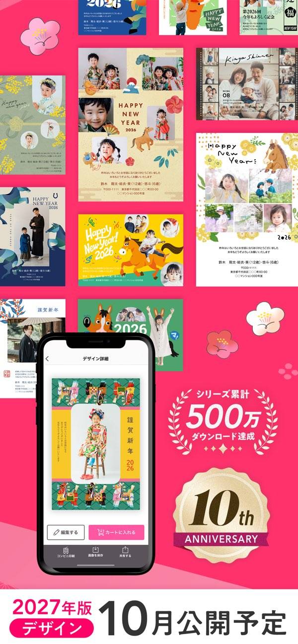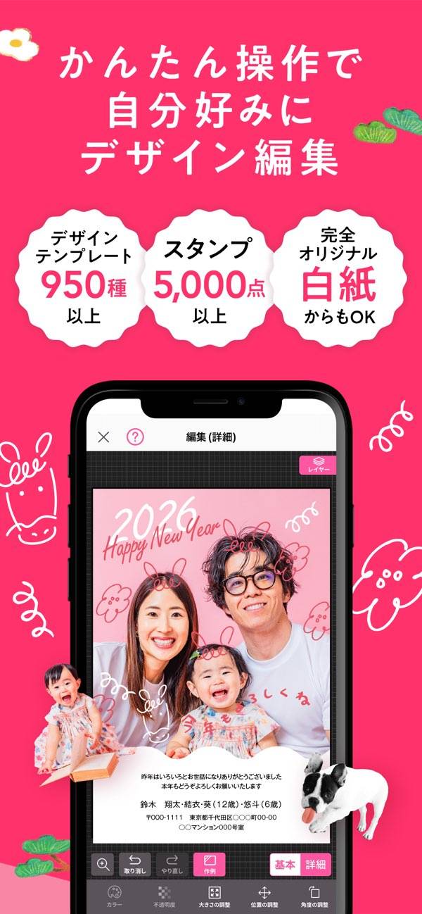 - スマホだけで写真入りの年賀状デザインが完成。テンプレートとスタンプ素材が豊富