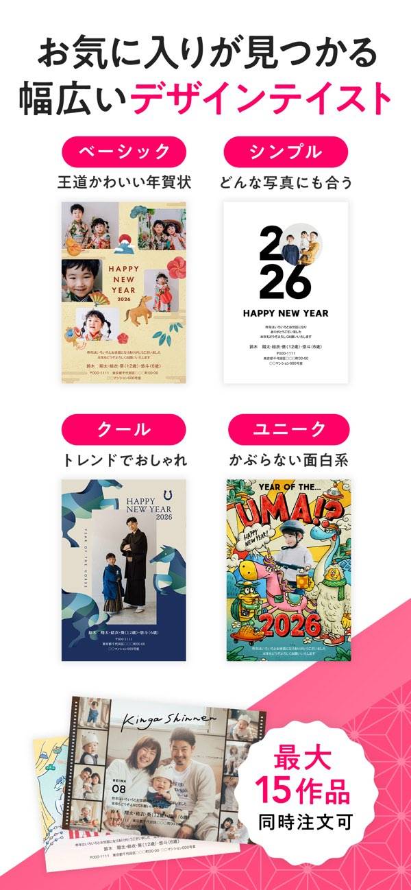 初めて利用させて頂きました。使い方が簡単で、しかも可愛いデザインが多くて、どれにしよえか迷いました。仕上がりも満足です。また来年も利用させて頂きたいと思います‼