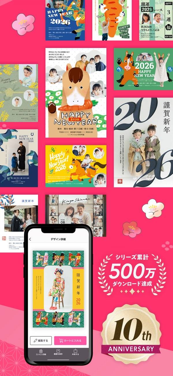 デザインテンプレートは全部で950種類以上あり、スタンプ素材も5,000種類以上用意。写真入りのファミリー向けデザインから落ち着いた雰囲気の挨拶状まで幅広くそろっており、用途に合わせて選べます。各パーツは大きさ、色、位置など自由に調整できるので、自分だけのバランスで仕上げるのも楽しいポイント。スマホの写真を組み合わせながら、こだわりの一枚に仕上げましょう。