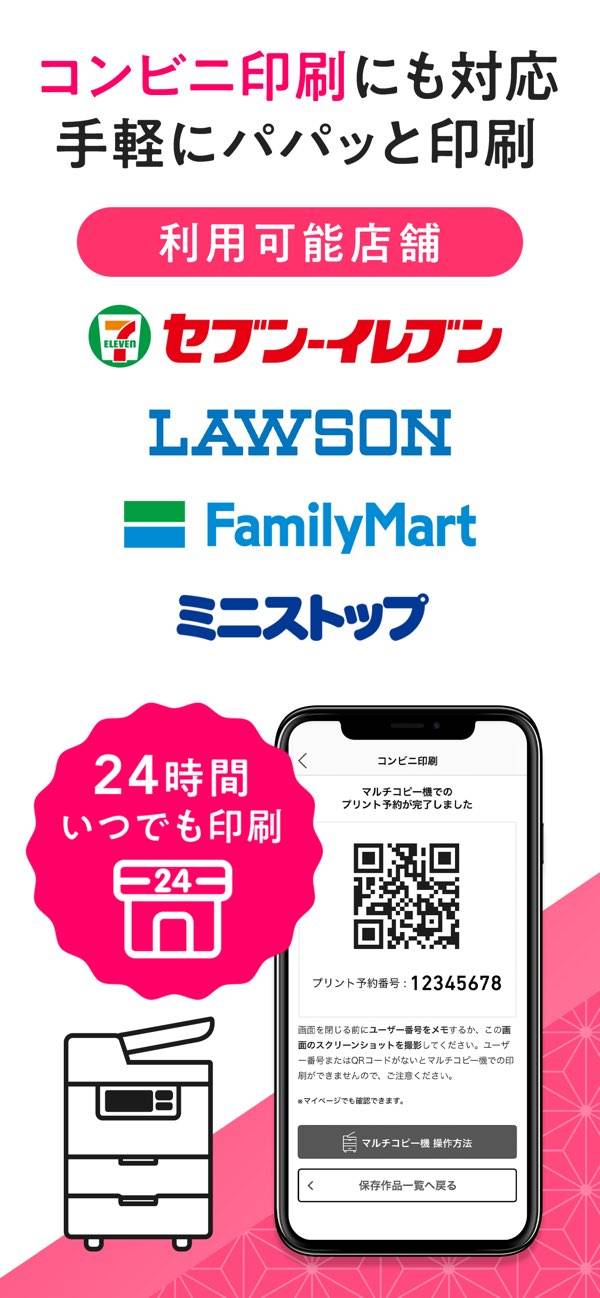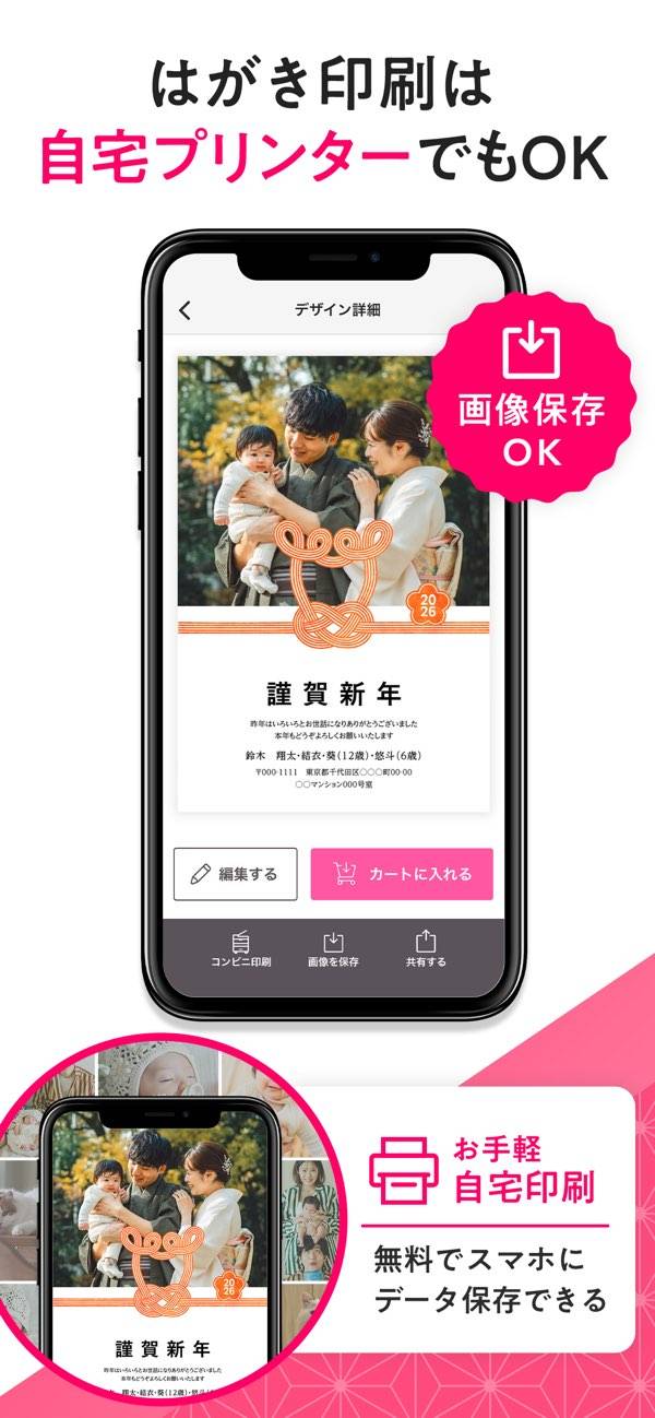作成した年賀状は、スマホ内に高画質データとして保存できます。保存後は家庭用プリンターでそのまま印刷できるため、突然ハガキが必要になったときにもすぐ対応可能。プリンターメーカーごとのスマホ用アプリに対応しているので、特別な準備なしですぐに印刷できます。急いでいるときや、数枚だけ出したいときでも安心です。
