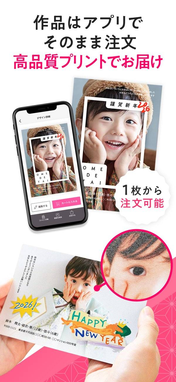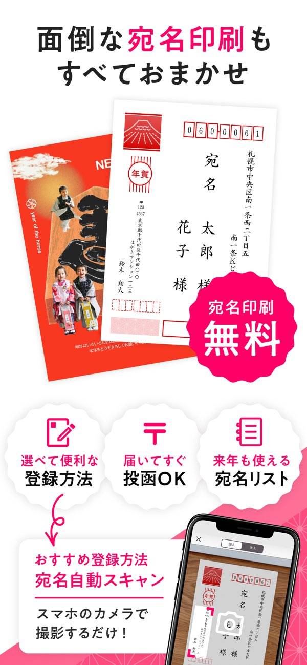 用紙は写真タイプとイラストタイプの2種類から選べ、それぞれプロ品質のプリントで仕上がります。しかも基本料金はかからず、1枚から気軽に注文可能。さらに宛名印刷も無料で利用でき、お手元の年賀状を撮影するだけで住所登録ができる「宛名自動スキャン」も便利。印刷だけでなく住所管理もまかせられるので、忙しい時期でもスムーズに準備が進みます。