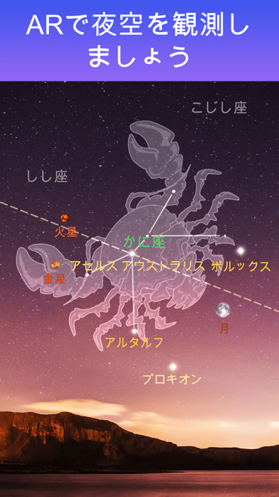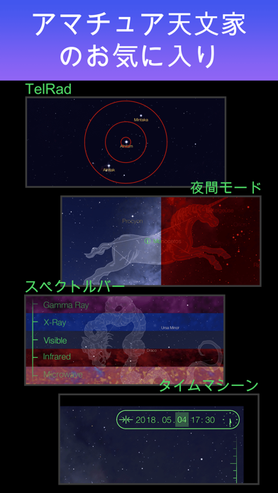 - GPS機能で、現在地から見える星空を表示。星座盤としても重宝する