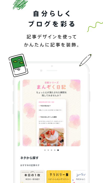 記事デザインを使って、ブログをおしゃれに装飾できます。例えば日記型のテンプレートは、単調になりがちな日常投稿が楽しくなるようなデザインがたくさん。またファッションやグルメなど、自分の趣味に合わせて選んでみてもいいでしょう。