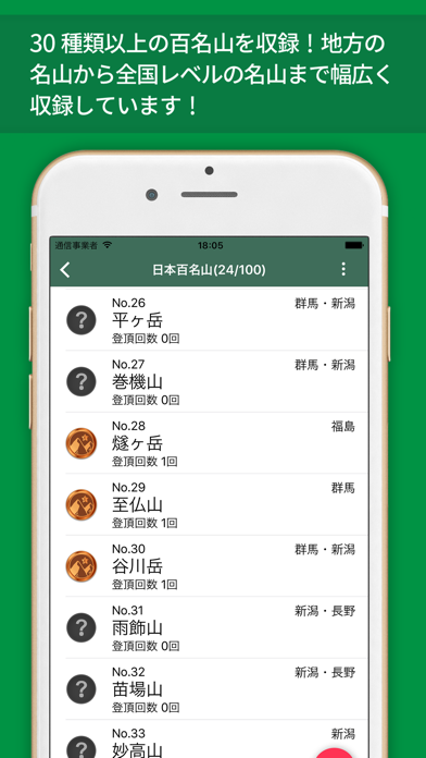 日本百名山や各地域の百名山、花の百名山など、多彩な山岳コレクションを収録。全国の名山だけでなく、地元の知られざる名峰も検索できます。地図上で確認できるため、次の登山先を探す際にも便利です。