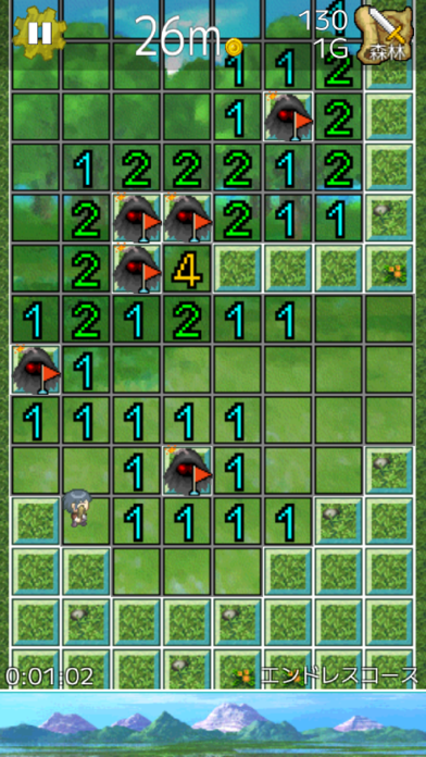 マインスイーパーと縦スクロールを組み合わせたアクションパズルゲーム。勇者の立つ地面となっているブロックを壊していき、最下層にいる魔王の元へ導きます。ブロックには爆弾が仕込まれているので、マスに表示される数字を頼りに避けていきましょう。爆弾をタップするとゲームオーバーです。