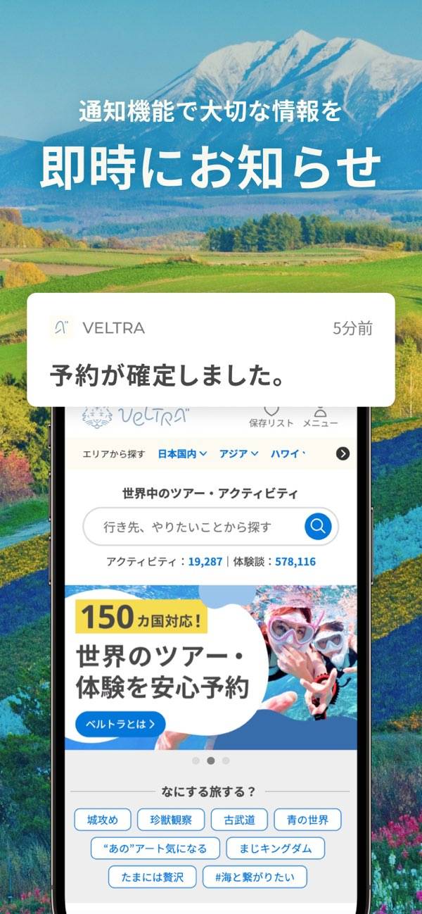 予約内容や集合場所の情報、持ち物の確認など、ツアーや体験に関することはアプリでまるっと管理できます。前日・当日に通知で予定をお知らせしてくれるから、見落とすこともなし。その日の気分でアクティビティを探すこともでき、旅の自由度がぐんと広がります。