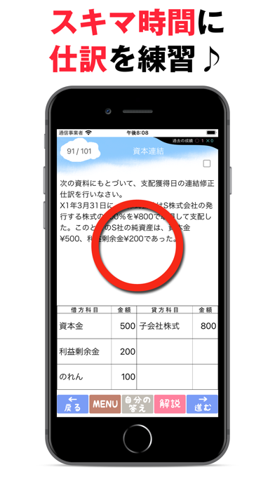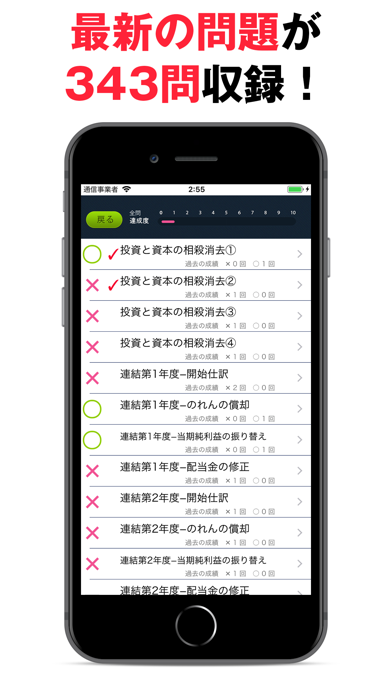 仕訳の問題が収録され、商業簿記の試験への対策ができるアプリ。商品売買やリース取引など、さまざまな場面で使われる仕訳の問題が入っており、分野別にしっかりと知識やスキルを鍛えられます。間違えても解説が見られるほか、間違えた問題だけを出題して復習も可能です。