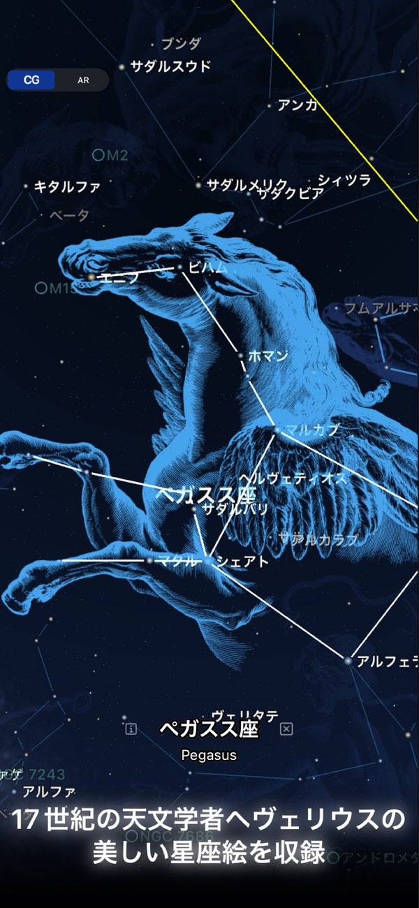 天体リストから、観測したい天体の位置へ移動できます。デフォルトの表示設定ではすべての星が表示されており、目的の天体が見つけづらい印象。天体リストをタップすることで探す手間が省けます。