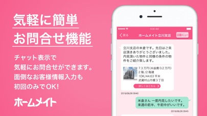 そしてアプリからなら、お問い合わせに必要な連絡先の入力は1回だけでOK。問い合わせのたびに何度も入力しなくていいんです。さらにその後の不動産会社とのやりとりもアプリ内で完結。あなたの物件探しに、ぜひ役立ててみてはいかがでしょうか。