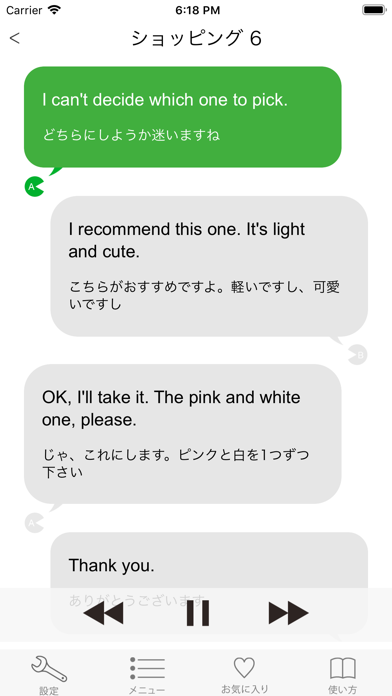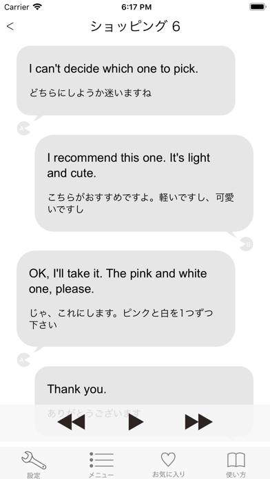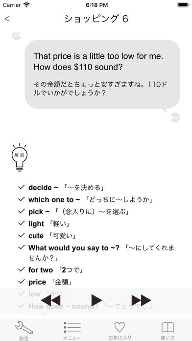 「英語→日本語→英語」に設定することで、聴き終わった後に頭に英語が残ります。通勤などの移動時や家事の合間などに、簡単にトレーニングできるのが嬉しいポイント。また苦手なフレーズは「お気に入り」に登録して繰り返し復習できます。