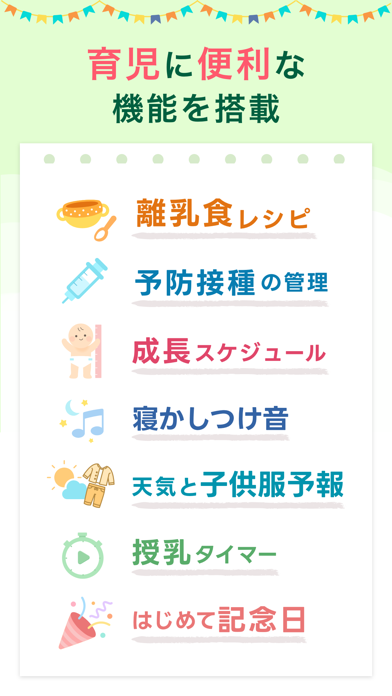 赤ちゃんの日齢に合わせて毎日の育児メッセージが届くアプリです。天気予報による子供服の提案機能や、離乳食の献立を毎日提案する機能などを搭載しています。初めての育児でも不安を軽減し、赤ちゃんの成長をしっかりサポート可能。忙しい日々の中で、効率良く育児情報を得たい方におすすめです。