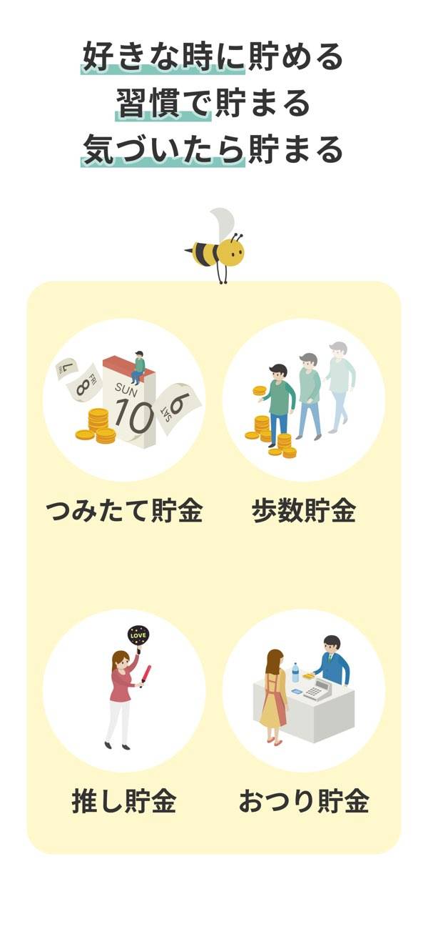 | 貯金の方法 | つみたて貯金/クエスト貯金/マイルール貯金/歩数貯金/おつり貯金/チェックイン貯金/空き枠貯金 |