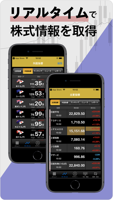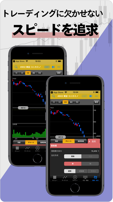使いやすさと情報量を重視した株取引アプリ。各種の情報収集や注文といった一通りの操作を、わかりやすいデザインの画面でカンタンに行えます。