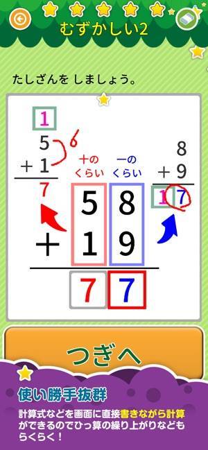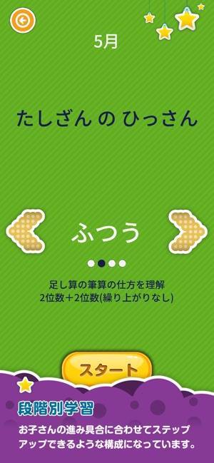 各問題に難易度が設定されており、適切な難易度の問題を選べます。基本的な足し算や引き算から複雑な掛け算まで、幅広い問題が用意されています。算数が得意な子も不得意な子も、無理なく学習を進められるでしょう。