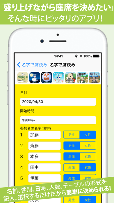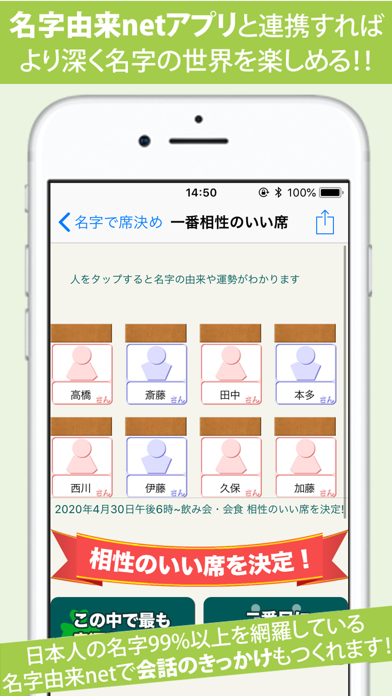 - 飲み会、商談、学校行事、何でもOK! 苗字の相性で席を決められる