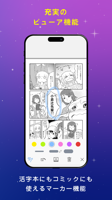 スムーズなビューア機能を使ってストレスなく読書を楽しめます。またオフライン利用や端末間での同期もでき、通信状況や時間・場所に関わらず快適に利用可能。さらにマーカー機能やページ一覧機能など、電子書籍ならではの機能も活用できますよ。