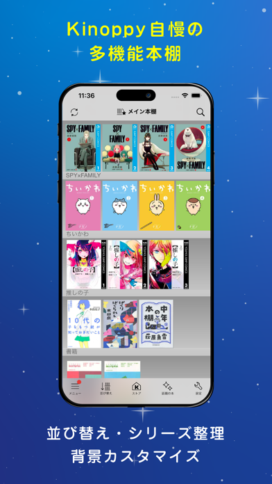 予約・購入した書籍を管理できる本棚機能が備わっています。本棚はメインとスマート本棚・クラウド本棚の3種類あり、詳細に分類して保存することが可能。また検索機能で簡単に本を見つけられるので、本が増えれば増えるほどその便利さが増していくでしょう。