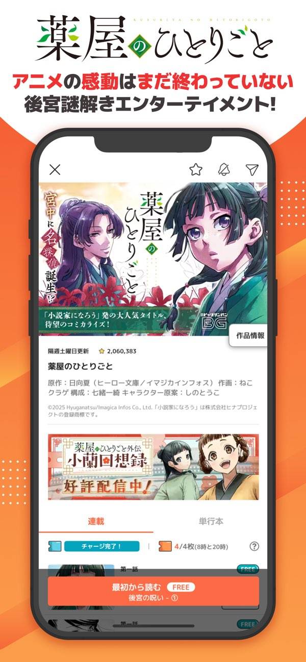 『鋼の錬金術師』や『その着せ替え人形は恋をする』などの名作を多数収録。異世界やファンタジー系の作品が多いのも特徴です。女性向けのカテゴリーがあるので、性別問わず楽しめますよ。1日2回、8時と20時にチケットをもらえ、合計8話を無料で読めるのも嬉しいポイント。