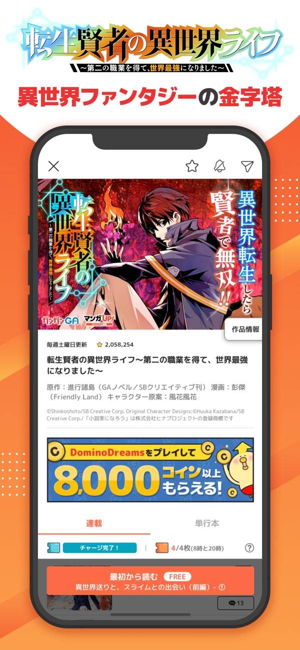 恐らく業界一なろう系マンガが揃っています。他アプリに比べて広告を見て回復出来るライフの上限も多く無課金でもすぐに読み進められます。