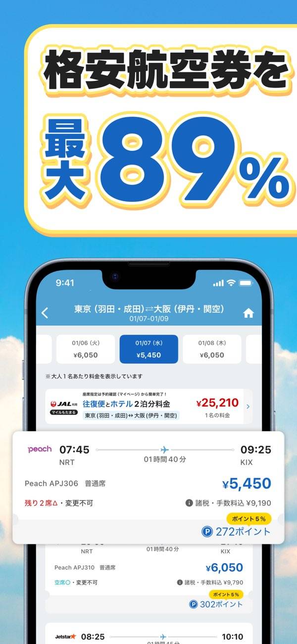 航空会社や日時から最安値のチケットを徹底比較できる総合旅行予約アプリです。国内航空券は最大88%OFFで予約可能で、航空券以外にもホテルや新幹線、ツアーなど、旅行に必要なあらゆるサービスに対応。