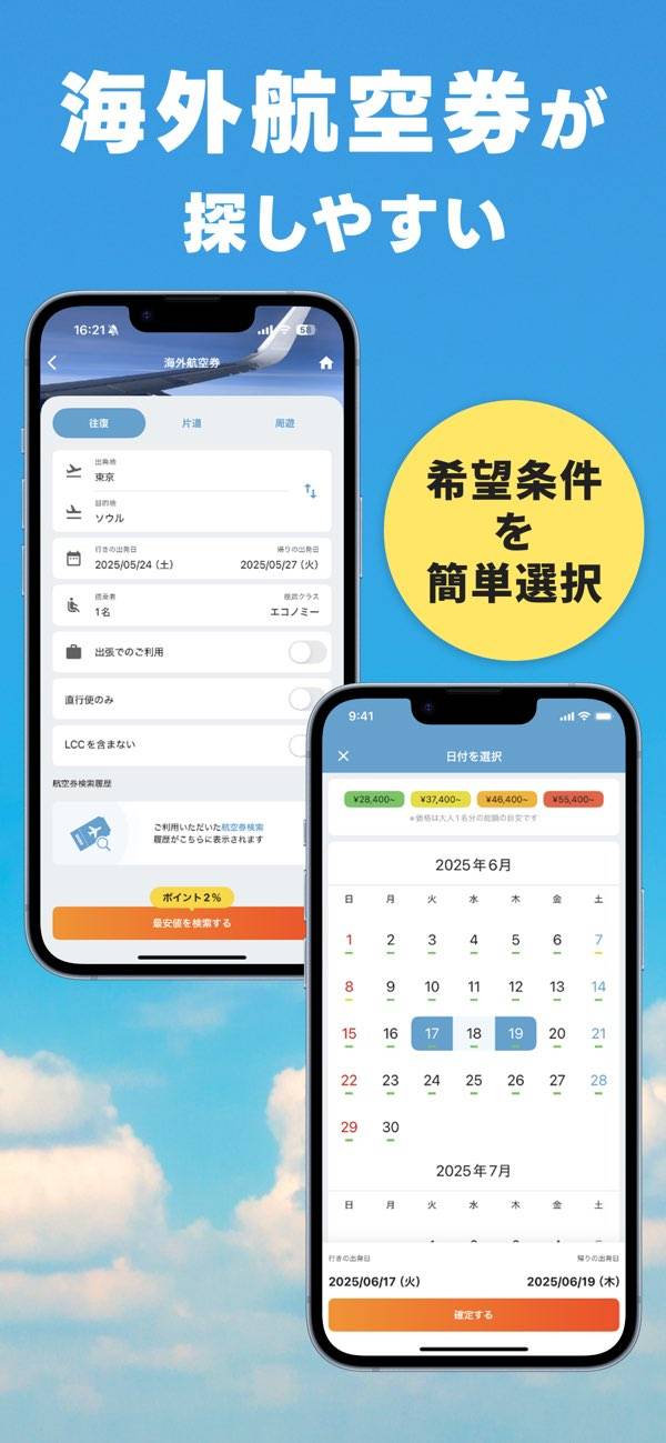 わかりやすい料金比較機能も大きな特徴の一つ。カレンダーで約1年先までの航空券料金をチェックでき、最安値の日程がひと目でわかります。特に海外航空券は目的地によって最安値の時期が異なるため、この機能で効率的に旅行計画が立てられるでしょう。