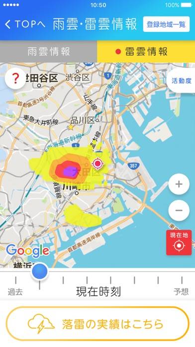 雨雲や雷雲の動きを地図で確認可能。過去から現在、さらには6時間先までの予測情報がわかります。接近する悪天候を事前に察知し、プッシュ機能で通知。外出計画やイベントの準備にとても役立ちます。