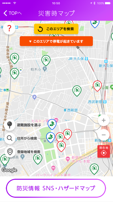 地点を登録しておけば、その周辺の避難場所を地図上に表示。経路もわかるので、いざというときに役立ちます。地震情報や停電情報などと組み合わせて、より安全な避難場所への避難が可能です。