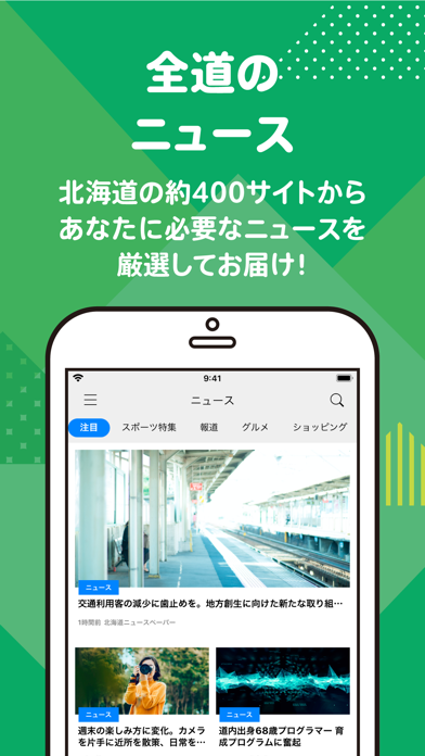 約400のメディアから発信されるニュースを、人工知能があなたの好みに合わせてお届け。注目のニュース、地域の事件や事故、道庁・自治体のお知らせ、経済・ビジネス情報、子育てに関するお知らせなどを知ることができます。