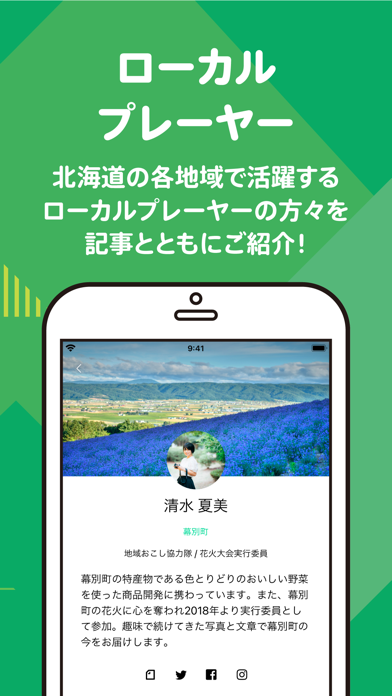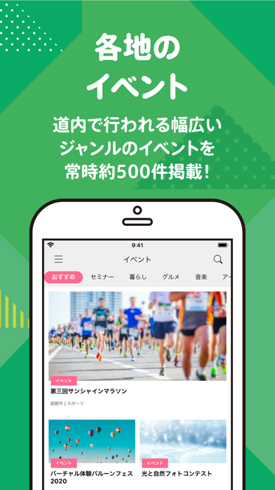 アプリの「ホーム」では、編集部が調査・取材を行った道内の記事が読めます。道内の注目イベント、イベントレポート、地元の人へのインタビュー、美しい風景、注目のローカルプレーヤーなどを知ることができます。