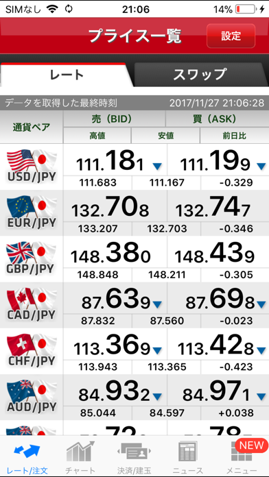 12種類の通貨ペアの為替レートをリアルタイムで確認。市場の動きを秒単位で追いかけられます。また、通貨ペアごとの直近の最高値と最安値も素早くチェックできるため、投資の判断材料になります。
