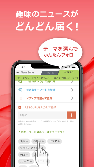 2つの機能で構成されたニュースアプリ。話題の記事が集まる一般的な「ニュース」に加え、興味のある情報だけを集められる「お気に入り」というRSS機能を搭載しています。タブ切り替えなので、最新ニュースが見たいとき、趣味の記事を読みたいとき、いつでもサッと使い分けられますよ。