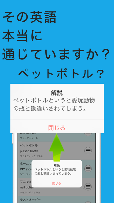 現代の日本人が、日常で使いまくっている和製英語をまとめたアプリ。「和製英語:ココア、本場:ホットチョコレート」などのように通じる言葉に言い換えてくれます。載っている単語が少なめなのが物足りなかった印象ですが、正しい発音もついているので参考になります。