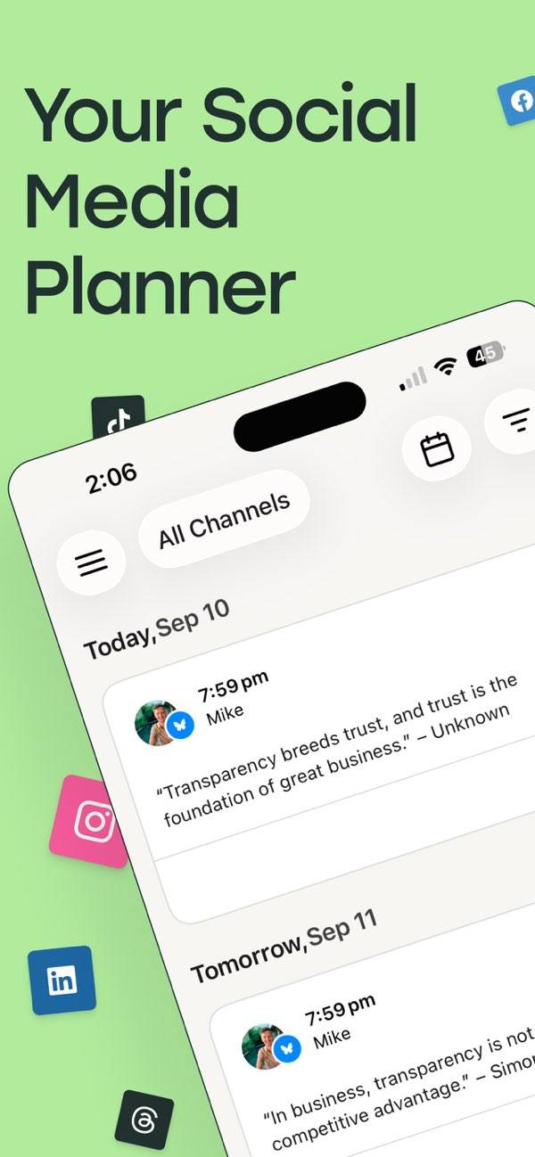 各種SNSへの投稿をこのアプリから行えます。一つひとつのアカウントを選んで個別に投稿することもできますし、複数のアカウントへ一斉投稿することも可能。またスケジュール投稿では、カレンダーから日付を選択できる手軽さがうれしいポイントです。