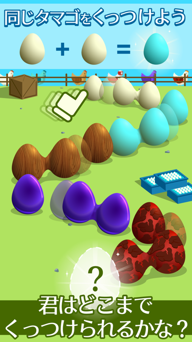 新種のタマゴを作っていく、養鶏場が舞台の放置ゲームです。「白+白→水色」といった具合に、同色のタマゴをくっつけることで、新しいタマゴが誕生します。「木目」や「プリン柄」など、ユニークな柄の新種をどんどん見つけましょう!